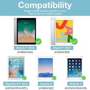 - 🍄 حافظة متينة واقية للأطفال للطراز القديم لجهاز آيباد 9.7 انش 2018 (الطراز القديم) آيباد الجيل السادس (رقم الموديل ايه 1893 / ايه 1954)2017 / آيباد الجيل الخامس (رقم الموديل ايه 1822 / ايه 1823)، وآيباد برو 9.7 2016 (رقم الموديل: ايه 1673\ ايه 1674 \ايه 1675)، ايباد اير 2 (موديل: ايه 1566 ايه 1567)/ ايباد اير (رقم الموديل: ايه1474/ ايه 1475/ ايه 1476)، لا يعمل مع أي طرازات أخرى من أجهزة ايباد. يرجى التحقق من الجزء الخلفي من جهاز الايباد للعثور على رقم الموديل