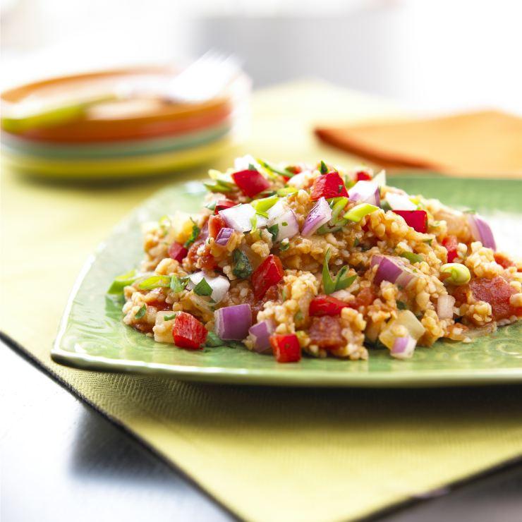 - في وعاء متوسط الحجم، قم بمزج الفلفل، البصل الأخضر، والخيار، والبقدونس. ثم ضفهم إلى البرغل.